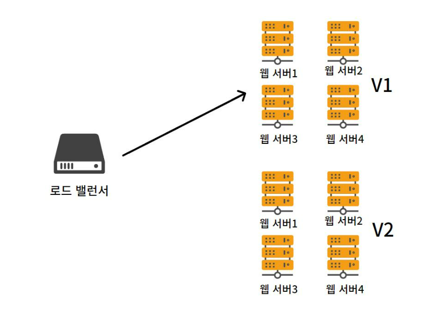 : 구 버전( 블루) 신 버전(그린) 이라고 부른다 블루 그린 배포는 기존버전의 서버가 있고 그것을 똑같이 복제한 서버를 두어서 , 로드 밸런서를 통해 모든 트래픽을 구버전에서 신버전 쪽으로 전환하는 방식이다.