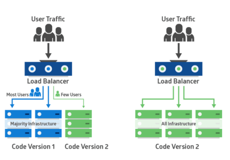 : 구버전과 새버전의 서버를 구성하고 일부에 트래픽만 신 버전으로 분산하여 오류가 발생하는지 여부를 판단한다.