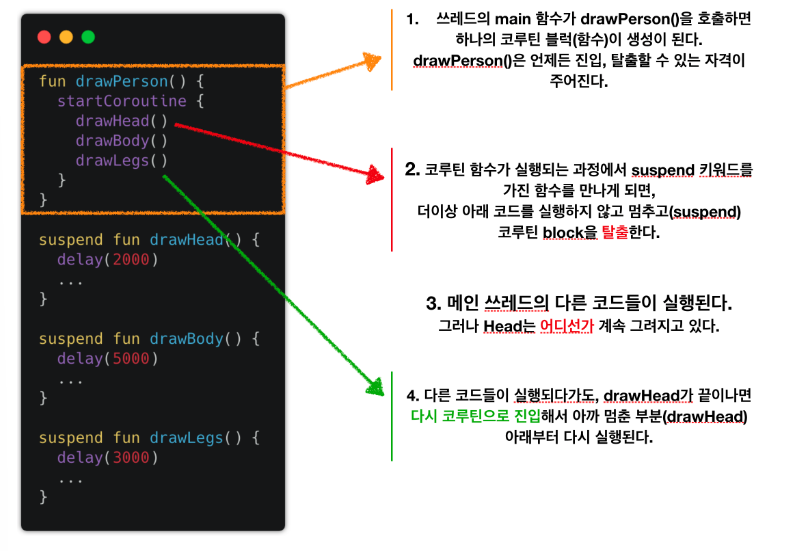 - 그렇게 메인쓰레드가 다른 코드들을 실행하다가도, drawHead()가 제 역할을 다 끝내면 다시 아까 탈출했던 코루틴 drawPerson()으로 돌아온다. 아까 멈추어놓았던 drawHead() 아래인 drawBody()부터 재개(resume)된다.