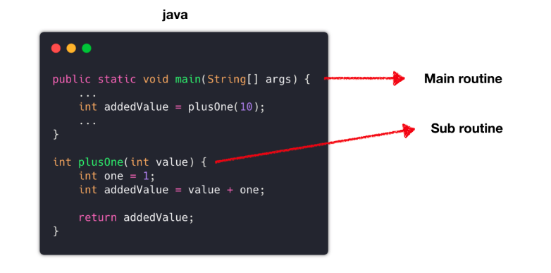 main 스레드가 plusOne()이라는 메소드를 호출하면 main routine에서 벚어나 Sub routine에 있는
