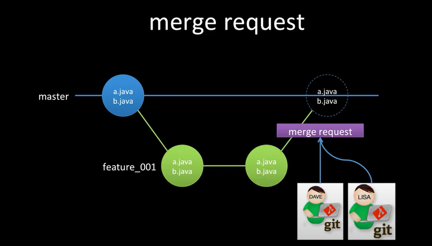 A->B개발자에게 merge request를보내면 개발자는 a 코드 리뷰 수행 이후 ok되면 merge한다.