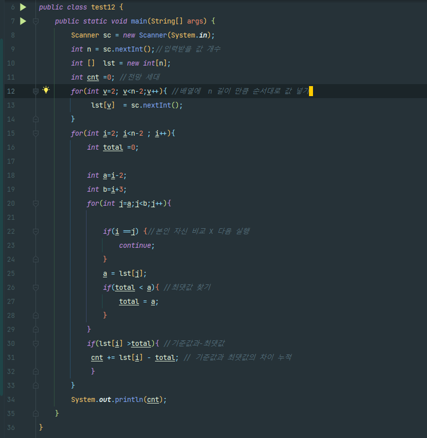 빌딩들에 대한 정보가 주어질 때, 조망권이 확보된 세대의 수를 반환하는 프로그램을 작성하시오.