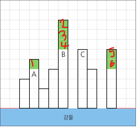 아래와 같이 강변에 8채의 빌딩이 있을 때, 연두색으로 색칠된 여섯 세대에서는 좌우로 2칸 이상의 공백이 존재하므로 조망권이 확보된다. 따라서 답은 6이 된다.