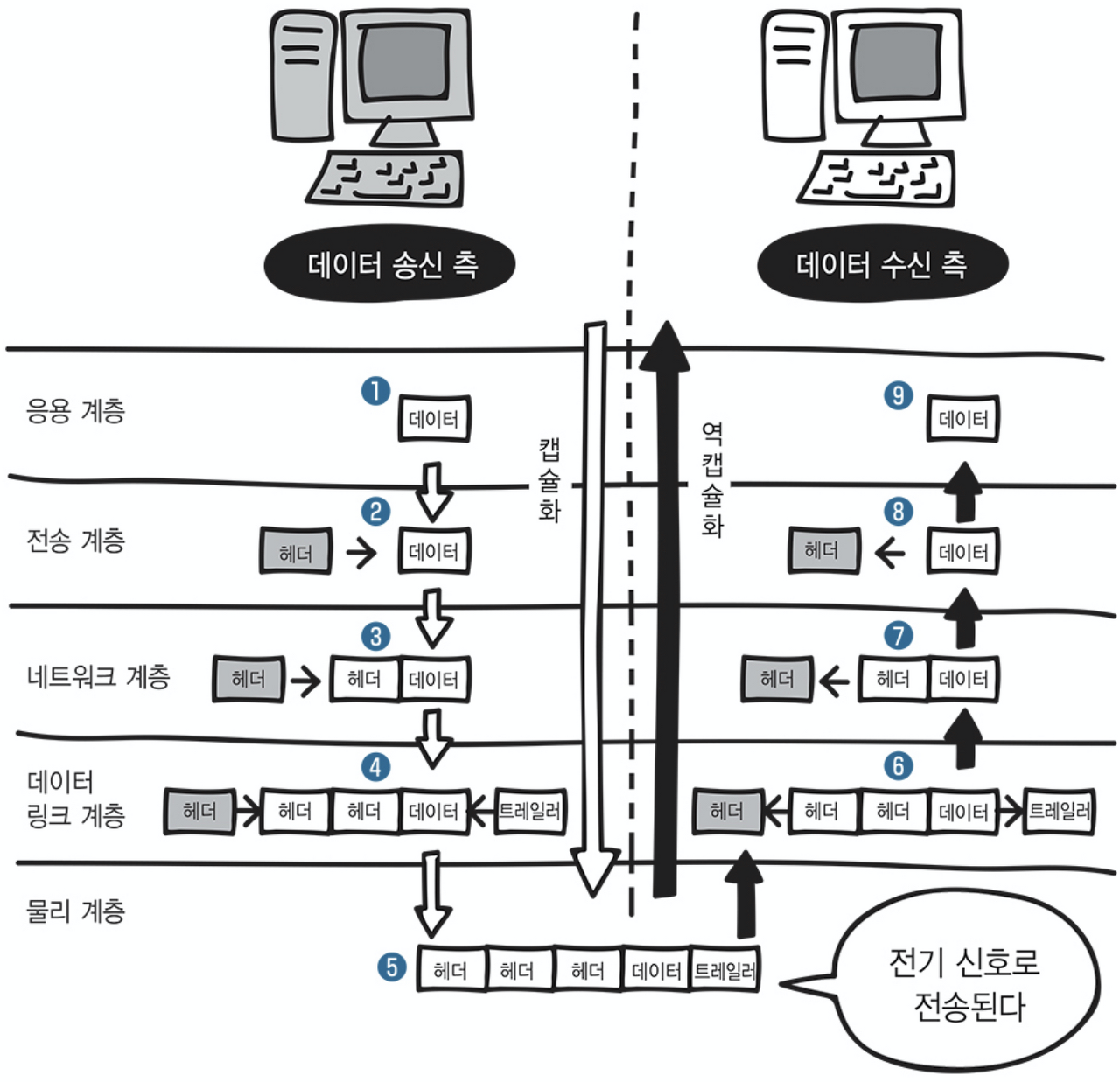 -데이터를 수신할때 각 계층에서 헤더(데이터 링크 계층의 트레일러도 포함)을 제거해 나가는 것을 역캡슐화라고 한다.