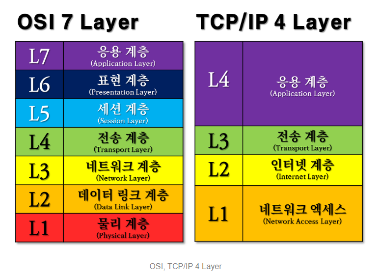 TCP/IP모델: 표현계층과 세션계층이 응용계층에 포함이 되어있다.