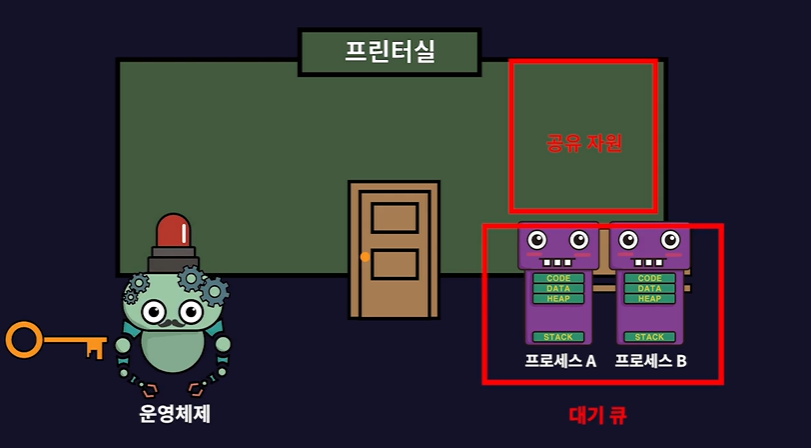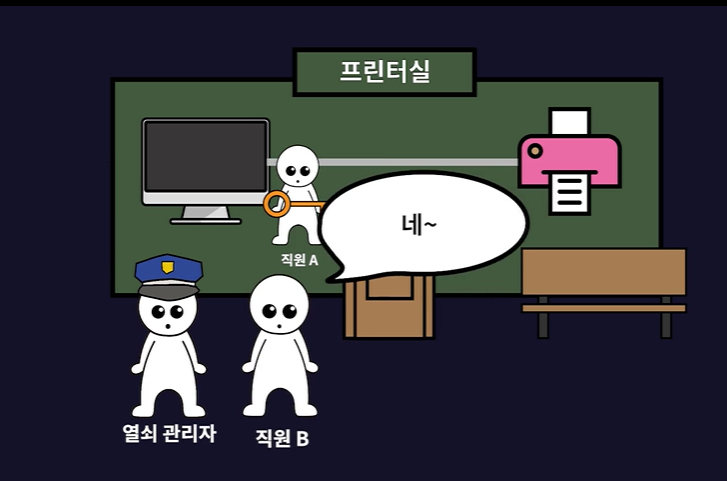 ex)프린터실을 따로 만들고 거기에 컴퓨터와 프린터가 있다 그것을 관리하는 관리자가 있따 직원은 관리자에게 열쇠를 받아서 프린터실에 입장해 혼자 사용할수 있다.늦게 온 직원은 이미 열쇠를 뺏겼기에 잠시 대기하고 있다.