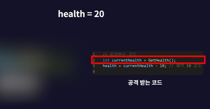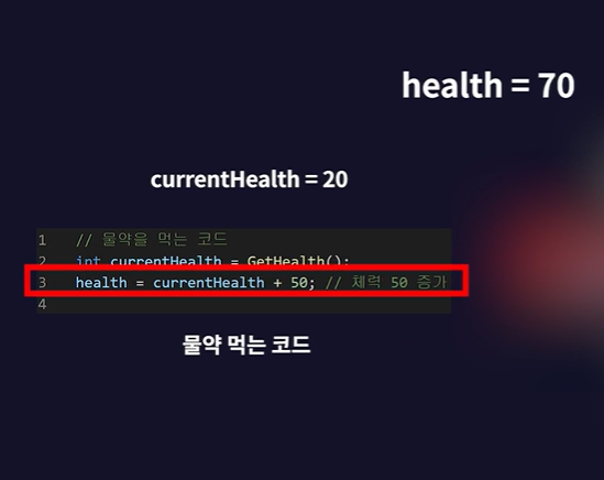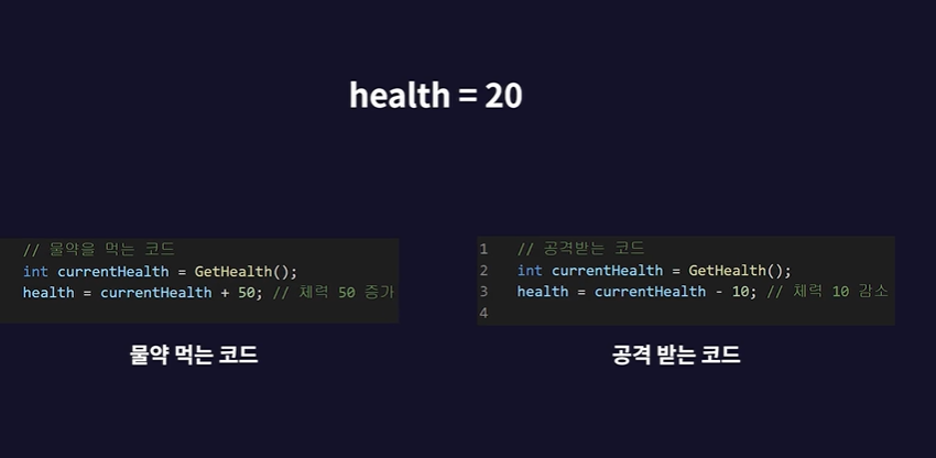 - currentHealth에 20이 저장이된다./ currentHealth =20;