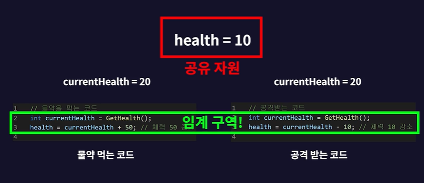 이유는 health라는 공유 자원을 여러 프로세스가 동시에 사용하기 때문에 문제 가 생긴다