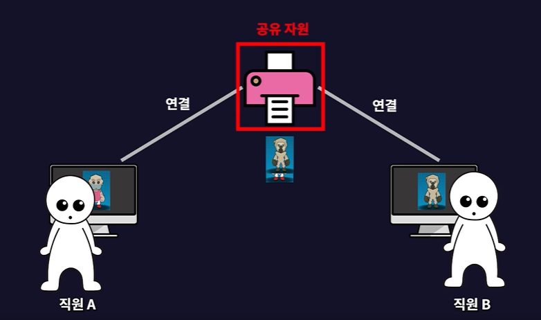 직원a와 직원b은 동시에 프린터 출력을 하게되면 프린터를 차지 하기 위해 경쟁 조건에 있게 된다