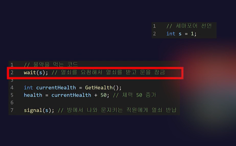 1.물약 먹는 코드가 실행된다 , wati ()함수를 호출한다 wait 함수는 열쇠를 획득하면 방에 들어가 문을 잠근다.