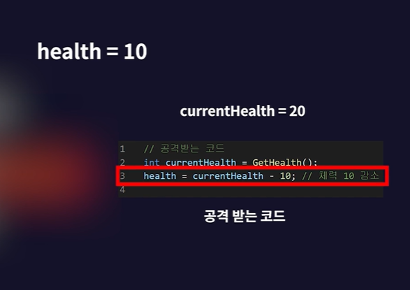- currentHealth에 20이 저장이된다./ currentHealth =20;