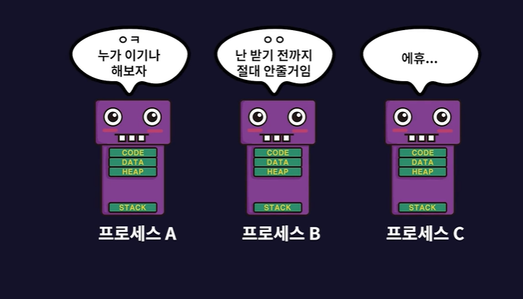 2.비선점이다, 프로세스 a가 리소스를 점유하고 있는데 프로세스b가 리소스를 빼앗을수 없어야 한다.
