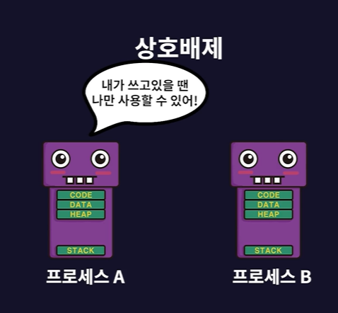 1.상호 배제:어떤 한 프로세스가 리소스를 점유했다면 그 리소스는 다른 프로세스에게 공유가 되면안된다.