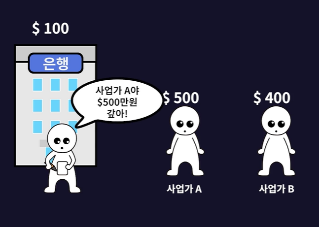 5.은행은 지금 100만원 밖에 없기에 사업가b에게 돈을 갚으라고