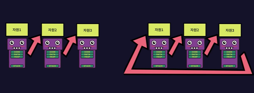 왼쪽은 순환구조가 생기기에 교착상태가 생기는 그래프이다 ,