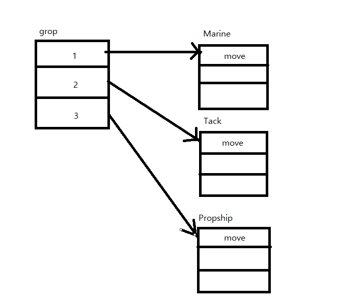 group[0].move(100, 200);//각자 구현 된 것들이 실행된다.
