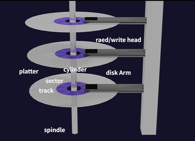 헤드가 움직이면 이 헤드들은 여러개의 플래터를 가리키게 되는 데 이때 여러개의 플래터에 있는 같은 트랙의 집합을 실린더라고 부릅니다 트랙은 다시 여러개의 섹터로 나뉘는데 이섹터가 하드디스크의 가장 작은 단위입니다