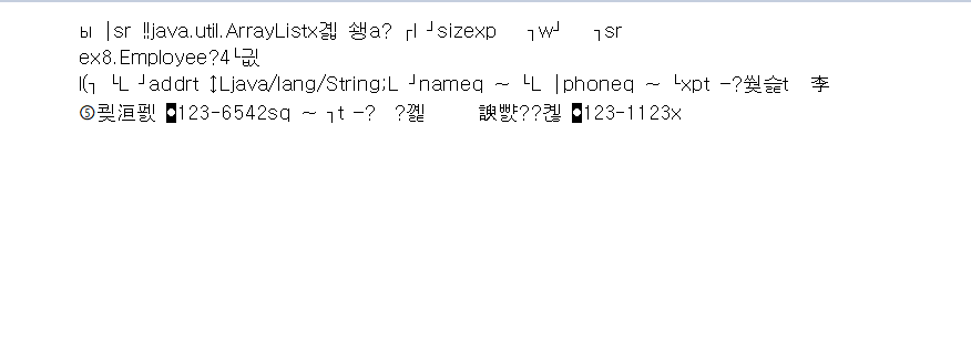 //직렬화 하는 데이터는 byte형식으로 저장 되다 보니 글씨가 깨진다.