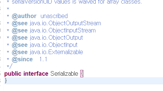 *Marker interface : serializable 클래스를 보면 속성이 없고 추상메소드 도 없다. 이렇게 선언만 된 인터페이스를 부른다.