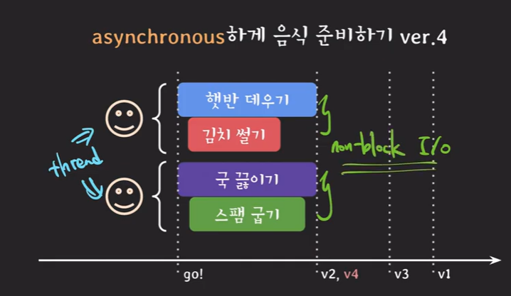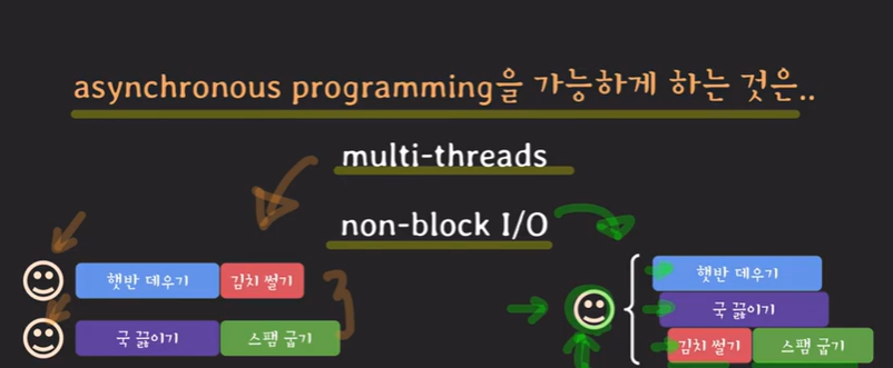 싱글 스레드: I/O작업하고 다른일 할수 있다, CPU작업과 I/O 작업은 동시에 할 수 있기에 non-block 이면 싱글스레드 라도 여러작업 처리가 가능하다.