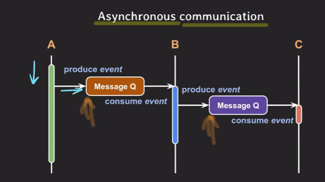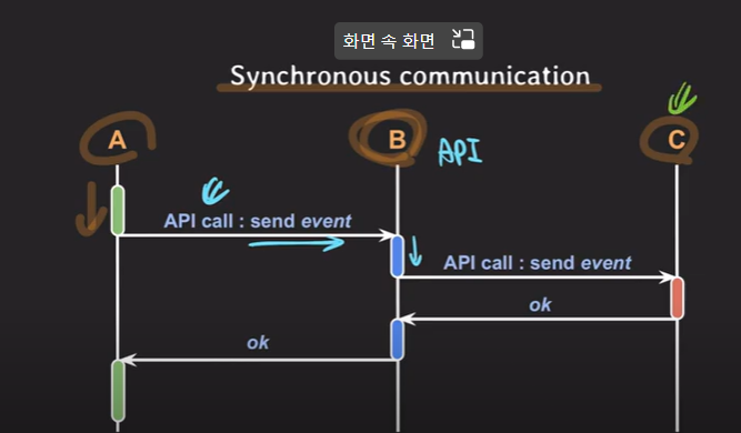 :A는 B에서 이벤트 전달시 Message Q라는 버퍼를 통해서 전달하기에 따로 기다리지 않고 작업을 해도된다.