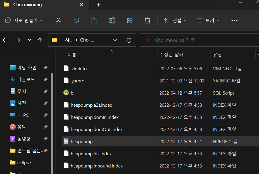 명령어가 성공적으로 실행되면 heapdump.hprof 이름의 Heap Dump 파일이 생성될 것이다.