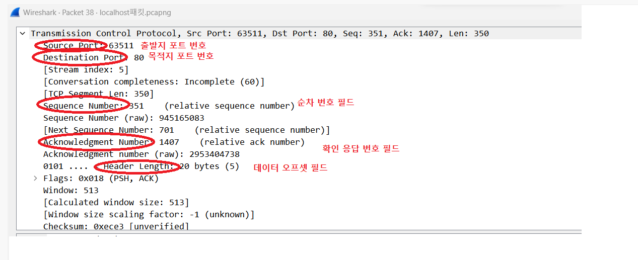- Destination Port (목적지 포트 필드) : 목적지 포트 필드는 수신지에서 오픈된 포트입니다. 위의 패킷을 보면 51462 포트인 것을 확인할 수 있습니다.
