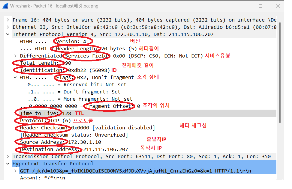목적지 IP 주소 : 패킷의 목적지 ip주소